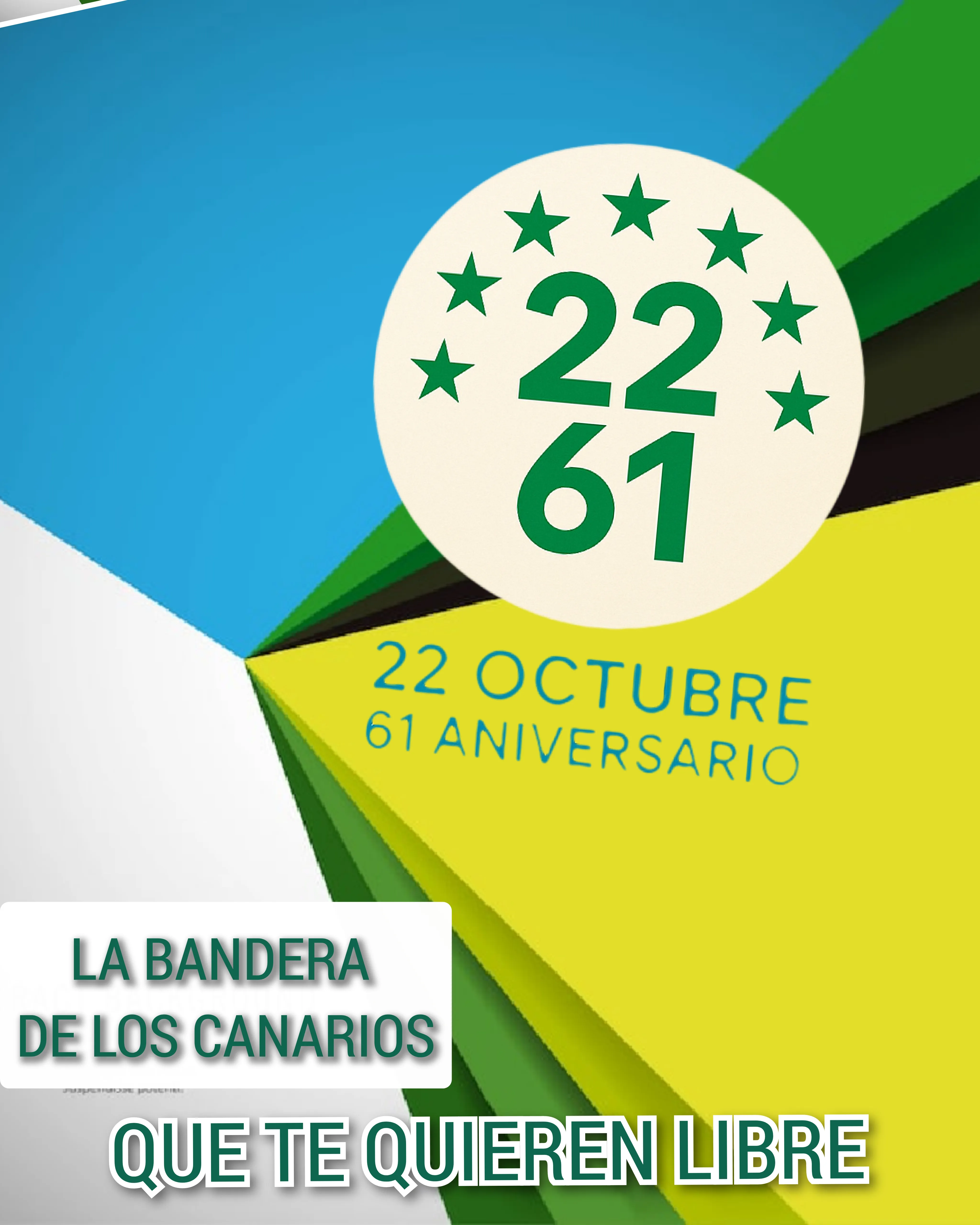 Este 22 de Octubre celebramos el 61 aniversario del nacimiento de la bandera nacional canaria, la bandera del pueblo canario, la bandera de la libertad, de nuestras luchas y anhelos. Este 22 de Octubre, estés donde estés, ondèala al viento. Dile al mundo, que es ella el mayor ORGULLO DE TU TIERRA. Por siempre, desde siempre y para siempre LA BANDERA NACIONAL DE CANARIAS.